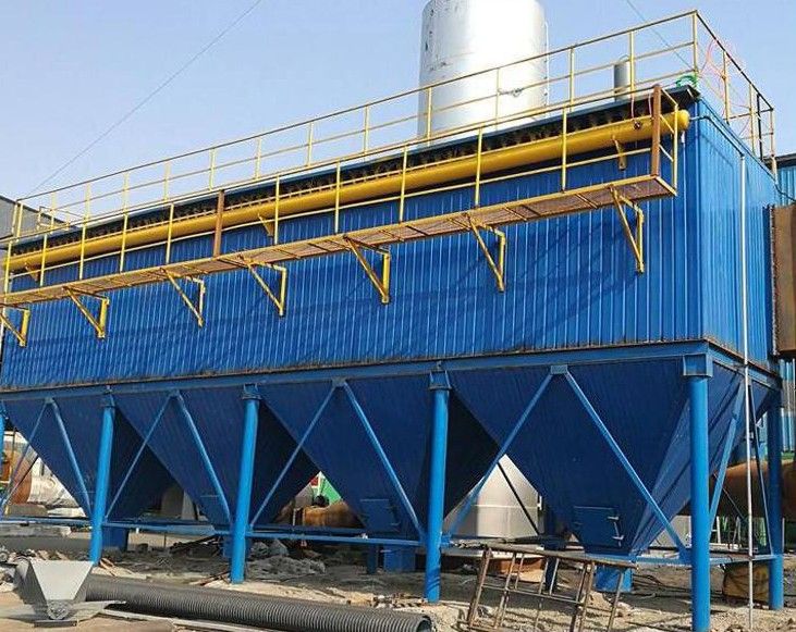 GA型大氣清灰袋式除塵器由進(jìn)出口煙道、除塵室、凈氣室、清灰系統(tǒng)及灰斗等組成。該離線脈沖除塵器工作時(shí)廢氣溫度降為130℃,瞬間可達(dá)180℃的含塵氣體由布袋除塵器中下部的進(jìn)口煙道分配后進(jìn)入各室的灰斗,煙氣由于折流和速度降低等原因使得比較粗、比較重的粉塵顆粒得以沉降,達(dá)到預(yù)分離的目的。細(xì)粉塵隨氣流轉(zhuǎn)折向上進(jìn)入離線脈沖除塵器的除塵室,由于離線脈沖除塵器濾袋的過(guò)濾作用,粉塵被阻留在濾袋的外表面,過(guò)濾后凈氣體由離線脈沖除塵器的濾袋內(nèi)部進(jìn)入各單元的凈氣室,并匯合于出口煙道"經(jīng)引風(fēng)機(jī)后通過(guò)煙囪排入大氣。
